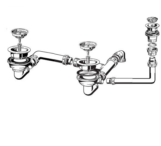 HPS-Ablaufverbindung 1½“ für Doppelspülen mit zentrischem Abgang, Höhenausgleichsstück und 1GA für Doppelspülen mit gleich tiefen Becken