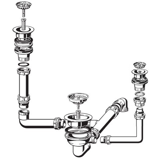 HPS-Ablaufverbindung 1½“ für Doppelspülen mit zentrischem Abgang, Höhenausgleichsstück und 1GA für Doppelspülen mit gleich tiefen Becken