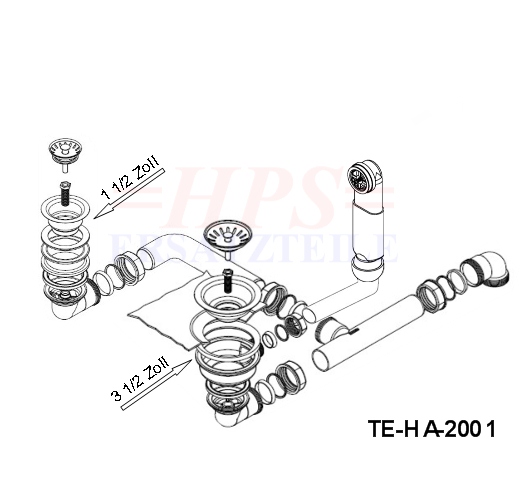 HPS-Ablaufverbindung 1½“ für Doppelspülen mit zentrischem Abgang, Höhenausgleichsstück und 1GA für Doppelspülen mit gleich tiefen Becken